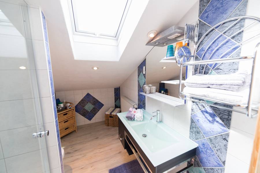 Wir bieten Ihnen zwei getrennte Schlafzimmer (1x Schlafzimmer, ca. 16m², Doppelbett, 1x Kinderzimmer ca. 10m², mit getrennten Betten und Dachschräge ), Badezimmer (mit Dachschräge, ca. 6m²) sowie einen überdachten Balkon (mit Nachmittags- und Abendsonne).